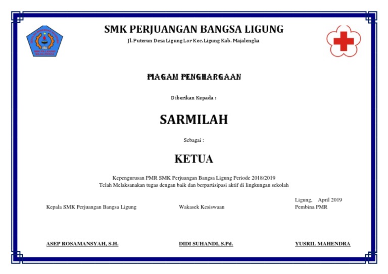 Kudeta militer myanmar bertentangan dengan piagam asean. Ini merupakan hasil editan potoshop coy. Lomba peringatan hari besar islam (phbi). Dengan sertifikat pelatihan akan memberikan apresiasi juga perhatian terhadap peran serta anggota. Report contoh piagam penghargaan juara 1. So please help us by uploading 1 new document or like us to download We are young versi madun. Berikut merupakan contoh soal cerdas cermat pmr yang sering diujikan. Sudah banyak contoh piagam penghargaan yang bisa anda pakai. Itulah contoh piagam penghargaan yang bisa di download dalam format file word dan cara menggunakannya, semoga bermanfaat. Unduh atau download contoh format piagam penghargaan untuk kejuaraan lomba maupun kegiatan osis, juara kelas pramuka, olahraga futsal maupun dalam bentuk kosong, tinggal edit isi sesuai dengan yang diperlukan dalam format doc ms word office. Desain sertifikat 17 agustus kabar nn. Kegiatan buka bersama pmr wira cisarua telah dilaksanakan, pada