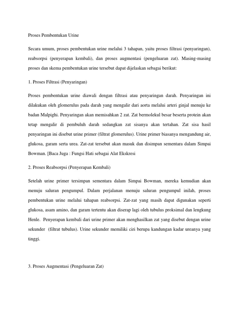 Dalam pembentukan urine terjadi menjadi tiga proses yaitu penyaringan ( filtrasi ), penyerapan kembali ( reabsorpsi ) dan pengeluaran zat ( augmentasi ).